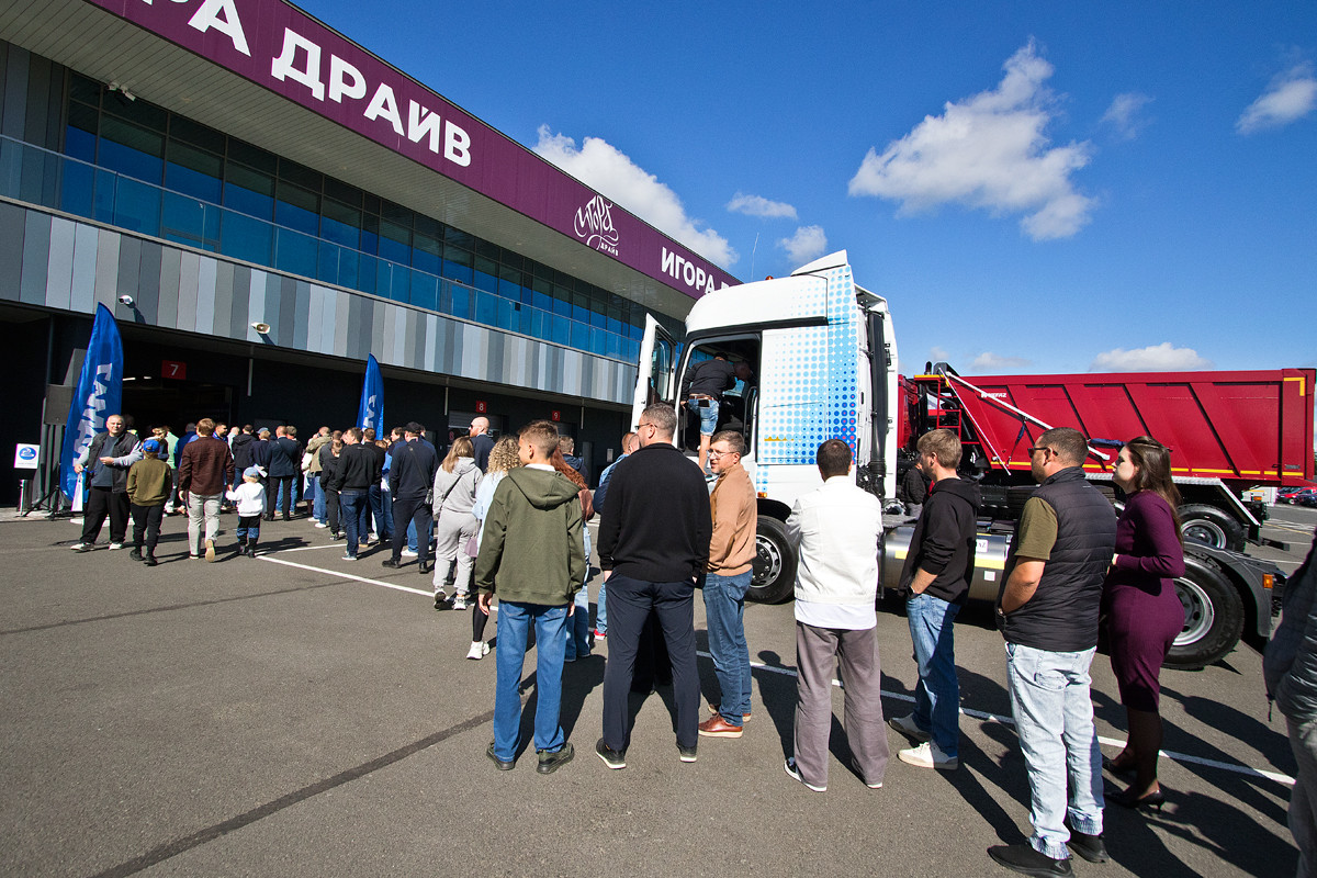 Перед спорткомплексом были выставлены «санкционно устойчивые» КАМАЗы К5 в различных версиях, по самому пятикилометровому кольцу можно было проехаться на любой из четырех выделенных машин (правда, только на одной из-за обилия желающих), все фотографировались на фоне гоночного КАМАЗа, а в зале показывали презентацию с рассказом о новинках.