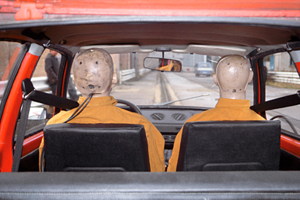 В салон автомобиля сажают два манекена и пристегивают штатными инерционными ремнями безопасности. Мужчину за руль, даму — справа. Оба манекена сделаны специально для краш-тестов, их вес — 75 кг у «мальчика» и 68 кг у «девочки», а топология их суставов рук, ног, шеи и масса всех частей тела соответствуют среднестатистическим антропометрическим данным. Вдобавок сидящий за рулем манекен оснащают тремя датчиками-акселерометрами — два в голове и один в груди. Еще два таких же датчика крепят на правый и левый пороги кузова. Провода от них сходятся в распределительную коробку, закрепленную за правым сиденьем, а оттуда сигналы по длинному кабелю идут в регистрирующую передвижную лабораторию, размещенную в микроавтобусе РАФ. Теперь вновь сделаем небольшое теоретическое отступление.