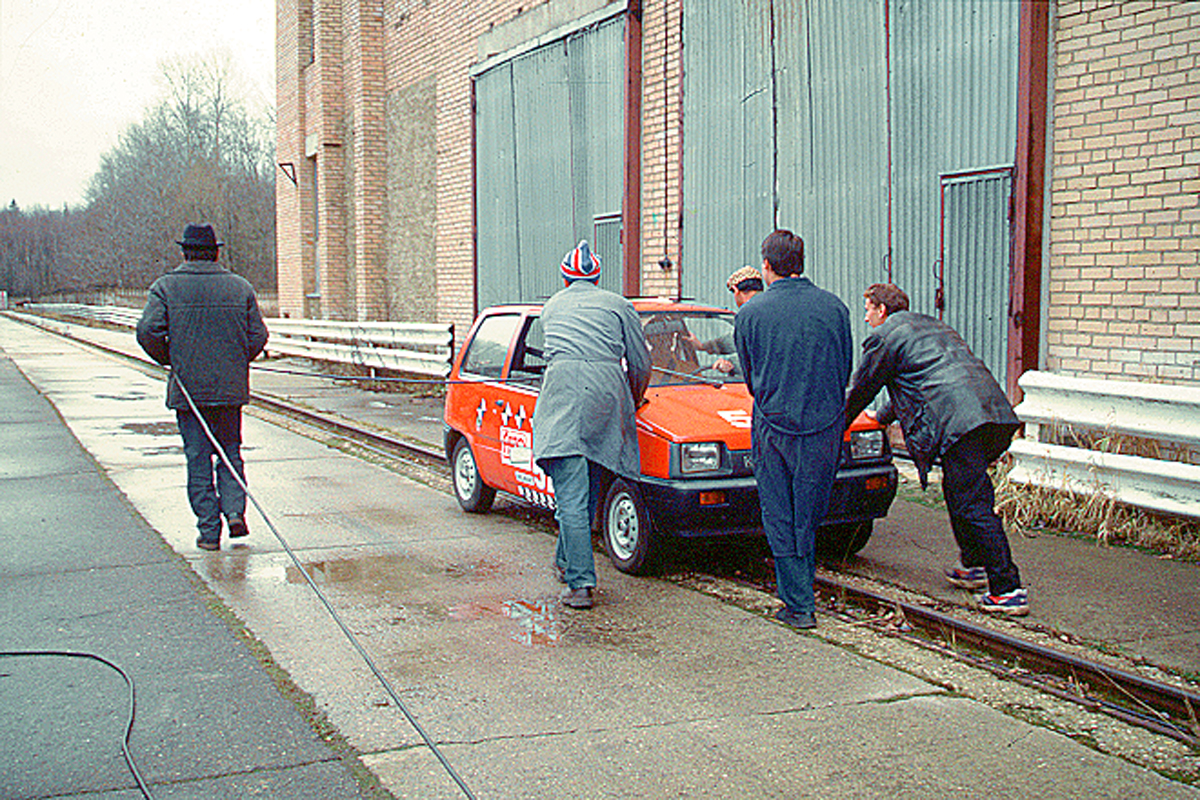 И вот «дубль три». Вся процедура повторяется, минутная готовность, пуск! Завыл барабан, наматывая трос, застрекотала камера... Ока пошла! Беззвучно набрала скорость, исчезла на мгновение в воротах, пулей влетела в ангар. Ба-бах! Короткий яростный удар, и с грохотом (дай Бог слышать его только на краш-тестах) покалеченную Оку отбрасывает вбок, и она, развернувшись, повисает на канатах, точно боксер в нокдауне. Сверху вещает голос распорядителя: «Скорость столкновения — пятьдесят один и четыре десятых километра в час».