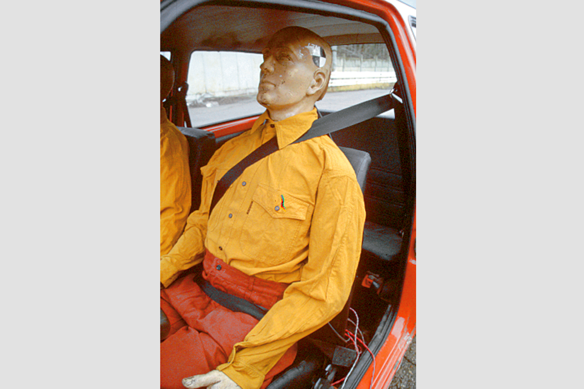 Именно поэтому элементы кузова вне обитаемой зоны конструкторы рассчитывают так, чтобы они при ударе сминались, аккумулируя энергию столкновения и смягчая действие перегрузки на человека. И именно для того, чтобы оценить величины замедлений, манекен за рулем оснащен датчиками — два в голове измеряют замедление в горизонтальном и вертикальном направлениях, акселерометр в груди — только в горизонтальном.