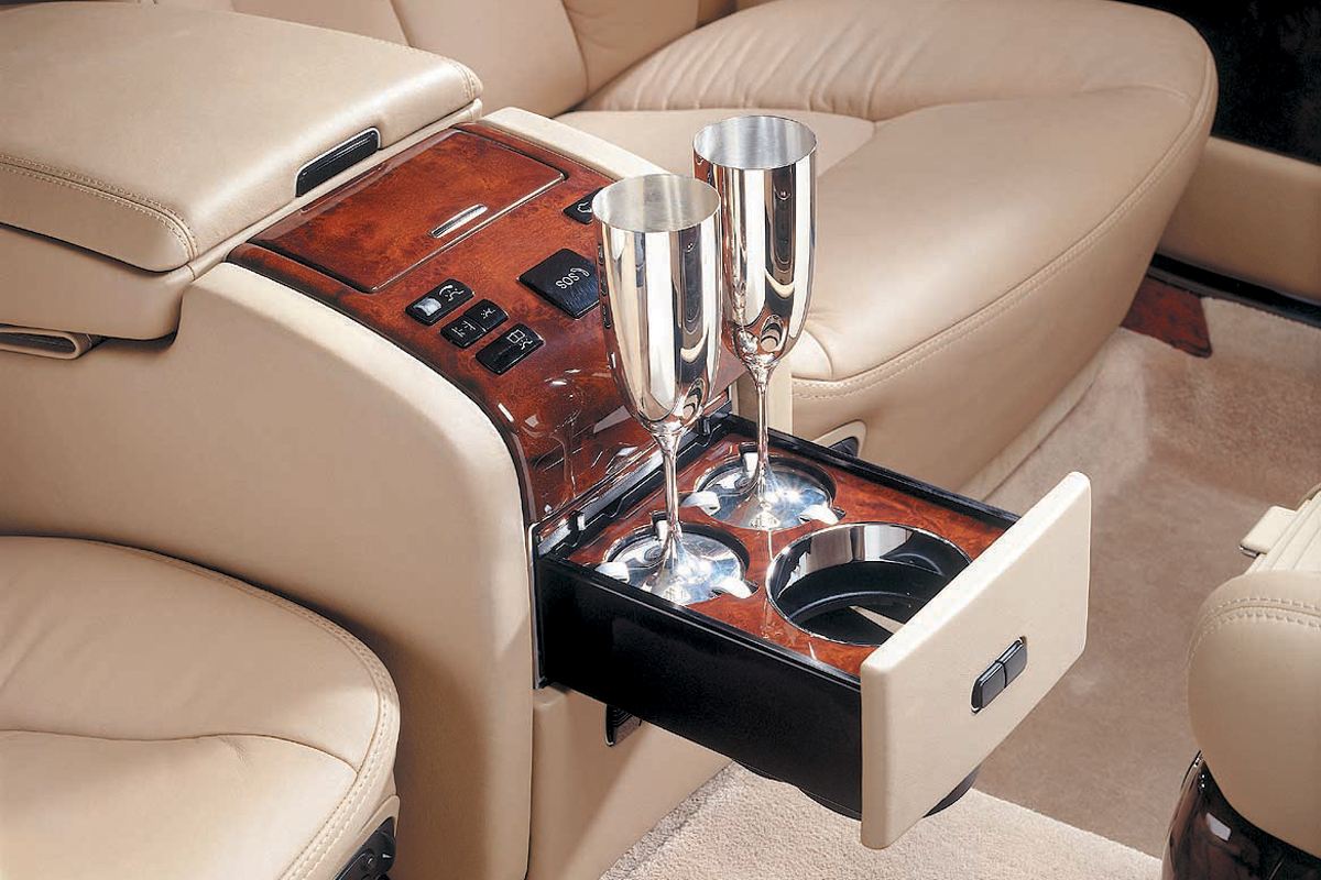 Вот, пожалуй, самая трогательная деталь интерьера Майбаха. Эти серебряные фужеры входят в стандартную комплектацию. И, будучи приведенными в «рабочее положение», фиксируются на подставке специальными лапками. Насколько я понял, бутылка «Вдовы Клико» тоже входит в базовую комплектацию, но сейчас она охлаждается в боксе-холодильнике (в любой момент ее можно извлечь и поставить в колодец рядом с фужерами)
