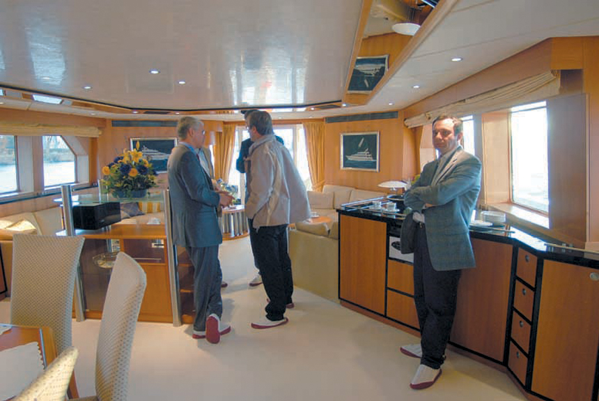На следующий день я должен был сам сесть за руль. Правда, не длинного Майбаха 62, а того, что покороче, Майбаха 57. Но произошло это не сразу. Сначала — на маленькую пристань, а там — на яхту «Ксения». Это не парусник, а моторная яхта, причем не маленькая, 41 метр в длину. На палубе — ящик с «бахилами»: их надо одеть поверх обуви, чтобы не повредить полировочку. Кстати, капитан (конечно, само радушие — «боже, какие гости к нам пожаловали, велкам, велкам...») тоже был в бахилах.