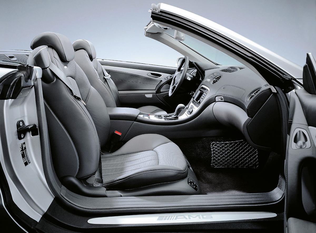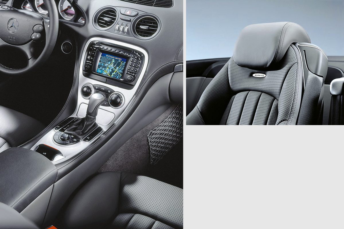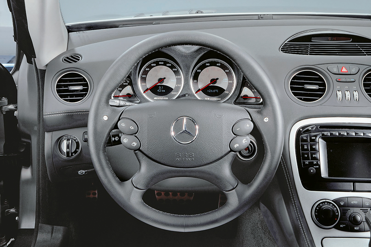 Каких-то кричащих примет, указывающих на то, что это не просто Mercedes SL, а SL55 AMG, здесь нет. Но есть характерные детали. Спидометр теперь размечен не до 260, а до 300 км/ч, стрелки приборов не белые, а красные, на шкалах -— надписи «V8 kompressor» и «AMG». И, конечно же, сиденья с более развитой боковой поддержкой