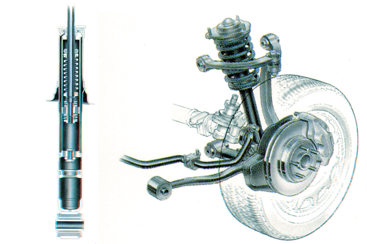 Подвеска передних колес — на двойных поперечных рычагах (все, как у S-класса!). Интересна конструкция амортизаторов — они двухтрубные, но подобно «однотрубникам» имеют плавающий поршень, отделяющий газ от масла. И вдобавок снабжены пружиной, срабатывающей при значительном ходе отбоя