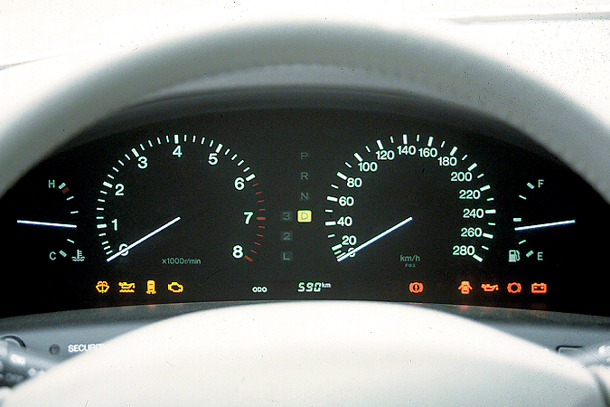 Удивлены кромешным мраком в проеме комбинации приборов? А ну-ка, включайте зажигание, сейчас я вам покажу ночные огни Бродвея... Смотрите — пока руль подползает к вам в руки, в бархатной темноте ярким белым огнем засветились четыре большие стрелки. А через мгновение вокруг них вспыхнули четкие шкалы тахометра, спидометра, указателей температуры охлаждающей жидкости и уровня топлива. Красиво? Припомните, какой еще автомобиль может похвастаться вакуумно-люминесцентной комбинацией приборов? Запамятовали? То-то же.