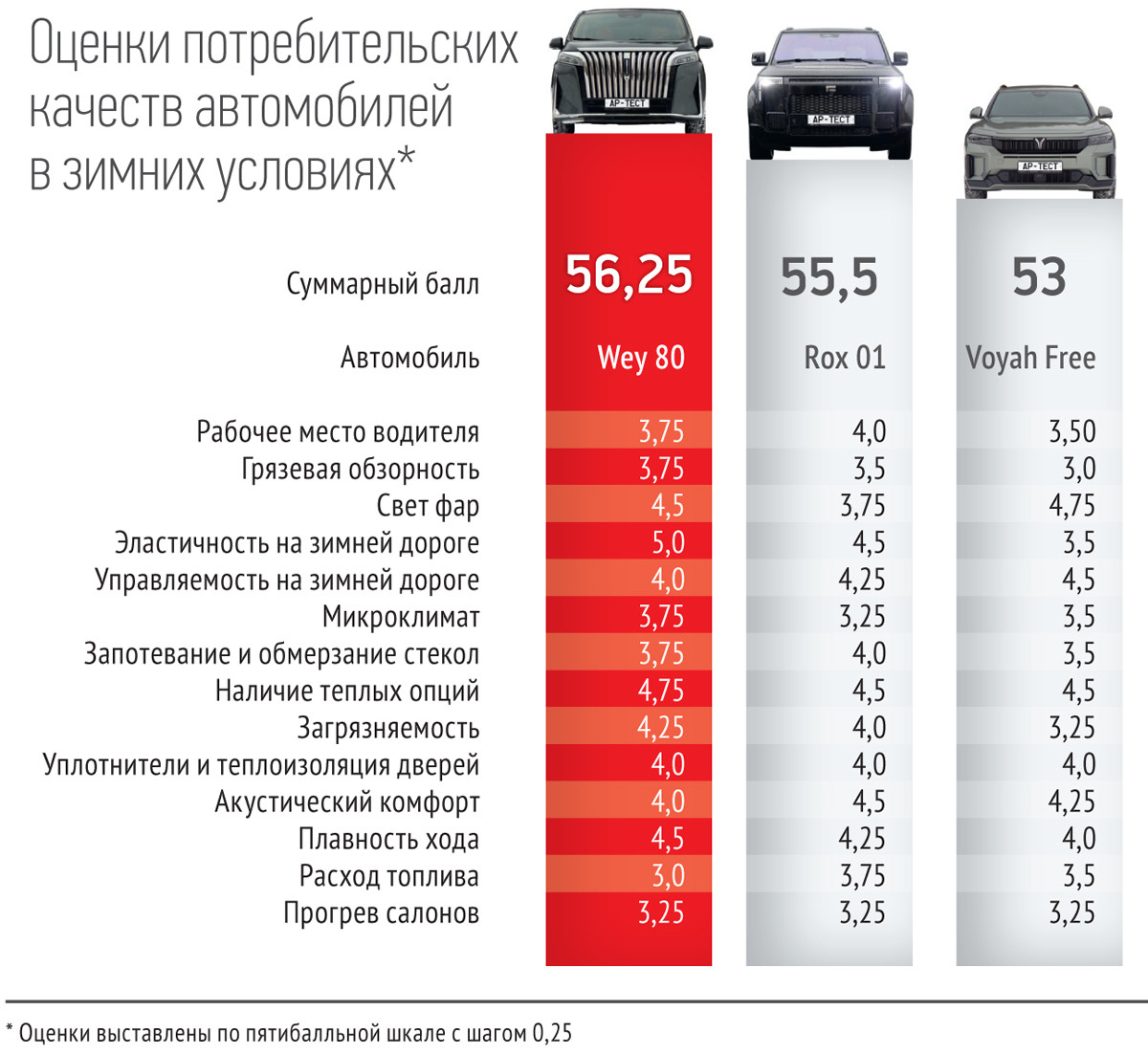 Большой кроссовер Rox 01 — это победитель рейтинг-теста Авторевю, и нам любопытно, как он проявит себя в зимних условиях, ведь при общей высокой оценке осенью мы отмечали нестабильную работу климат-контроля. На обновленном кроссовере Voyah Free с регулируемой подвеской мы еще не ездили, а между тем в 2025 году он оказался самым популярным гибридом на российском рынке. С минивэном Wey 80 в длиннобазной версии Business Lounge (на законодательной кириллической волне сейчас она называется Премиум Лаундж) я лишь шапочно познакомился на дорогах Кавказа, и, в отличие от соплатформенного Вея 07, минивэна у нас еще не было на разного рода сравнительных тестах.
