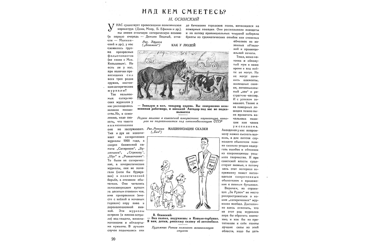Главный редактор журнала «За рулем» Валериан Оболенский (Николай Осинский) выступал первым популяризатором автомобилизации Союза, но встречал немало скептиков и критиков, поэтому и сам становился героем карикатур. После ареста и расстрела Осинского некоторые библиотеки будут замазывать его изображения и упоминания его имени в архивных экземплярах журнала