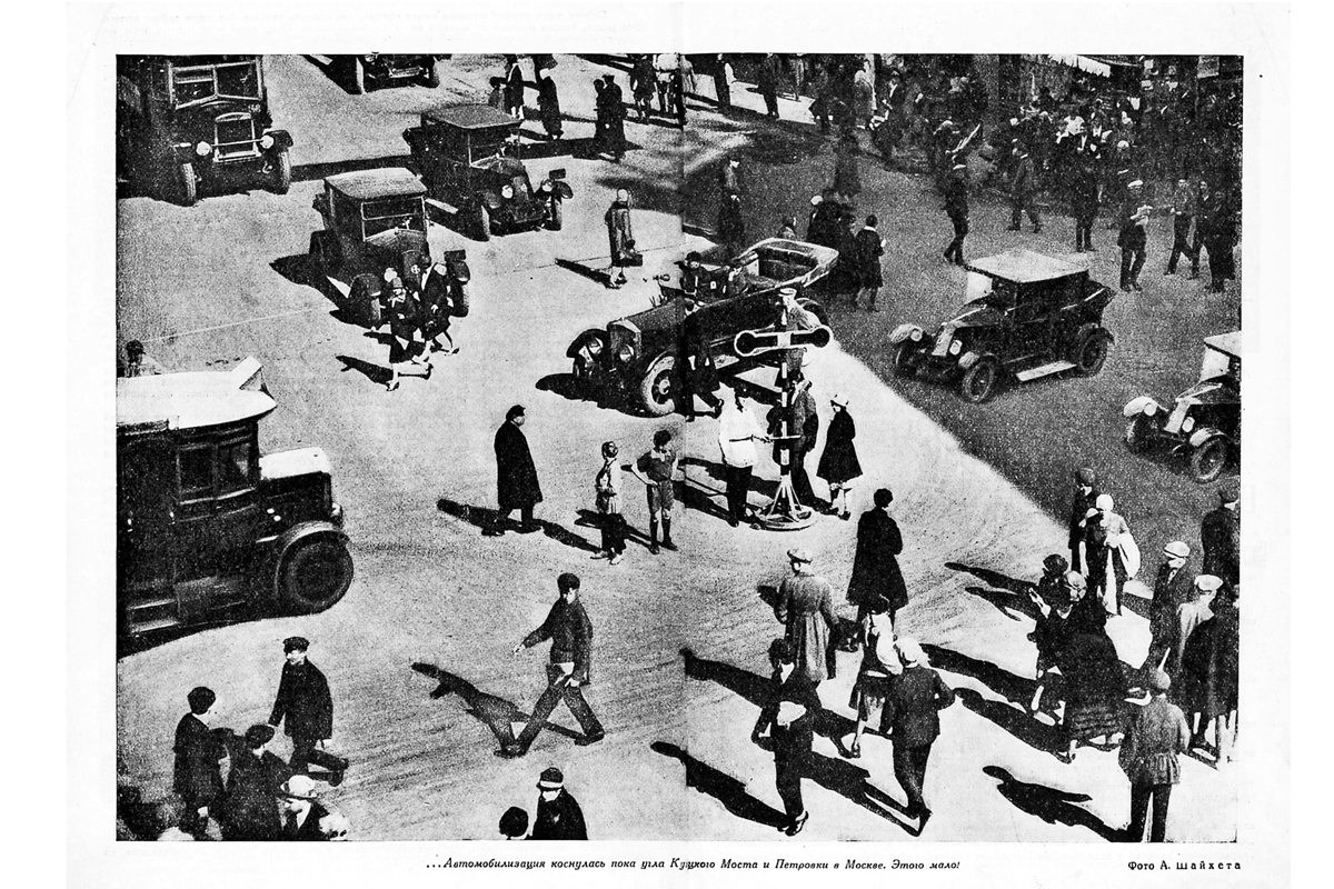 В 1928 году сценарист и литературовед Виктор Шкловский в статье «Барахло на ходу» пишет, что ему доводилось «ездить в Киев на прокатной машине, у которой на крыле лежал мальчишка, подручный шофера, и подливал из бутылки бензин в карбюратор». Новые автомобили можно встретить лишь в Москве, для которой, например, в 1925-м закуплены полтора десятка таксомоторов Renault KZ — именно они видны на этом снимке Аркадия Шайхета. Журнал констатирует, что автомобилизация добралась лишь «до угла Кузнецкого Моста и Петровки», и словами Шкловского призывает заменить рухлядь новыми машинами: «Идеал современной техники — электрическая лампочка, которую не чинят. Идеал Автомобиля — такой автомобиль, срок пользования которого точно известен, который не ремонтируется, а только заменяется»