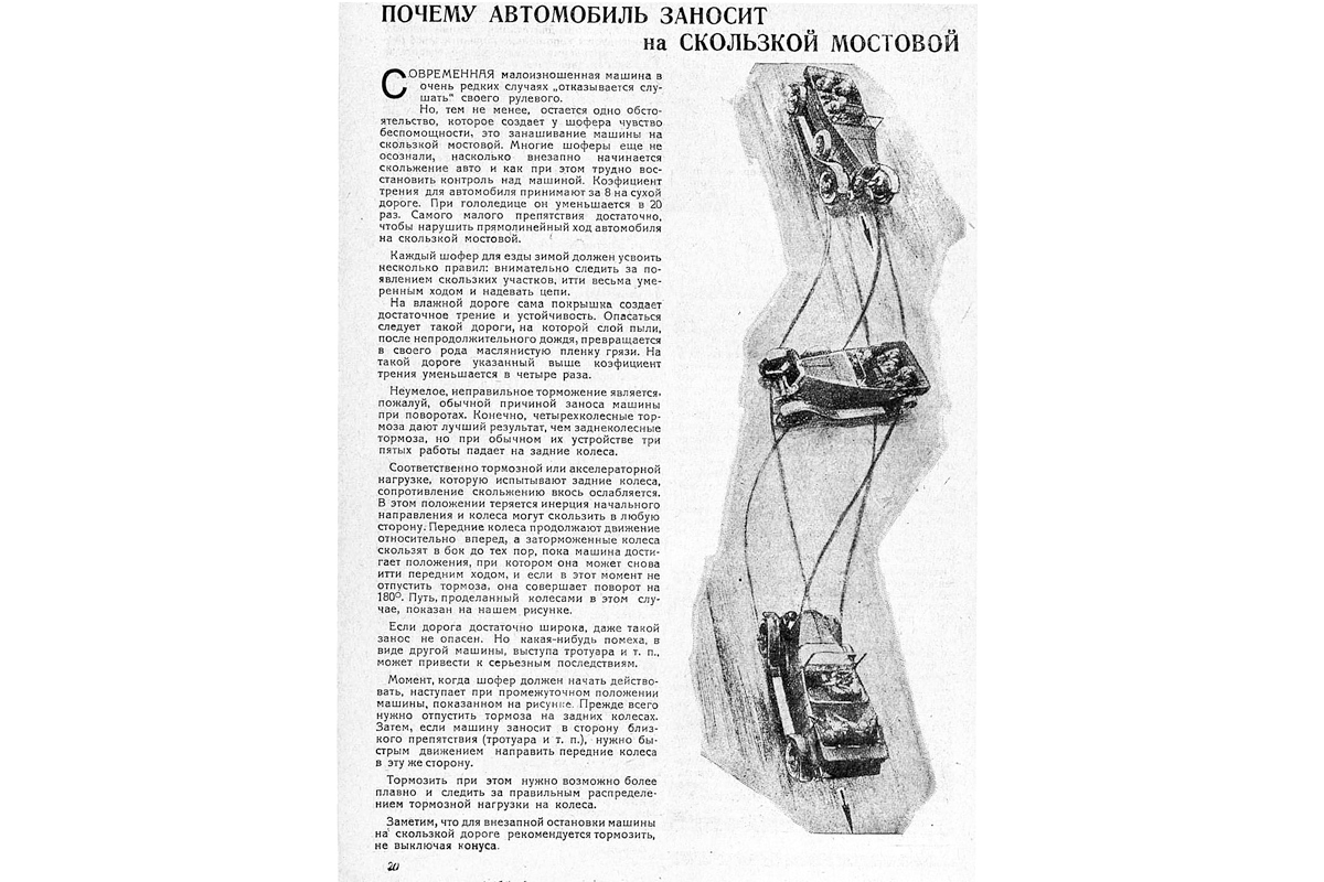 Материалы, которые хочется перечитать спустя 90 лет, в подшивке 30-х годов почти не встречаются. Среди исключений — первые статьи Юрия Долматовского. Или, например, публикация 1930 года, которая, кажется, впервые описывала «занашивание» автомобиля, то есть езду в заносе. Точнее, борьбу с ним. Журнал объяснял, что на скользкой мостовой при неумелом торможении или разгоне у задних колес падает «сопротивление скольжению вкось» и что рулить в такой ситуации нужно в сторону заноса.
