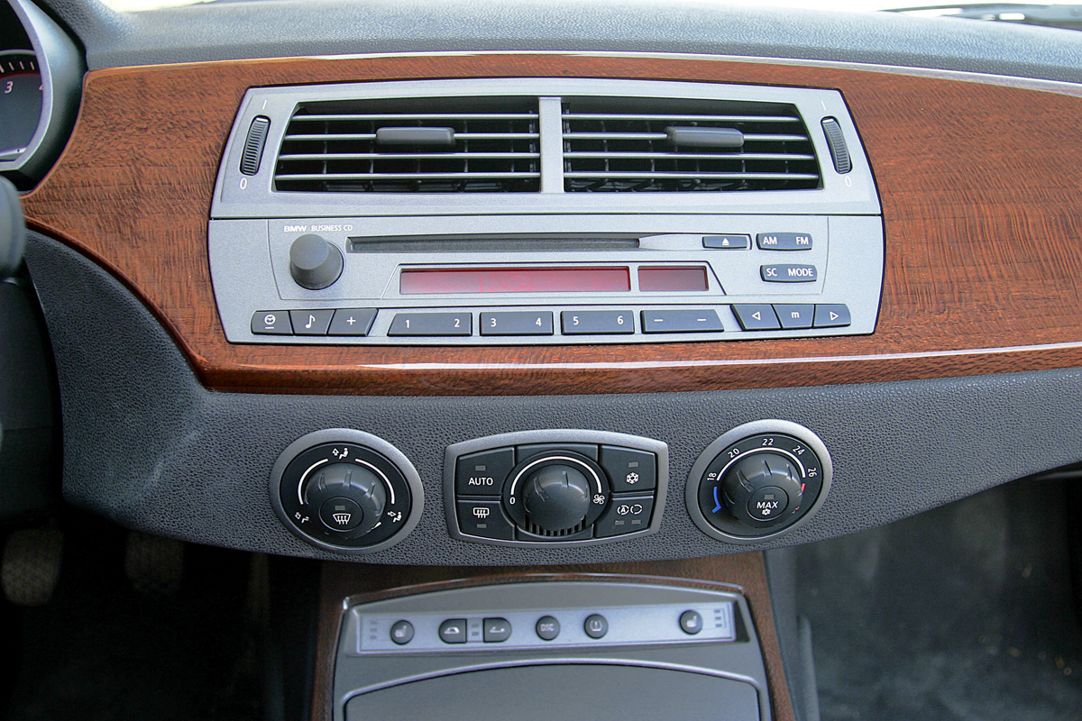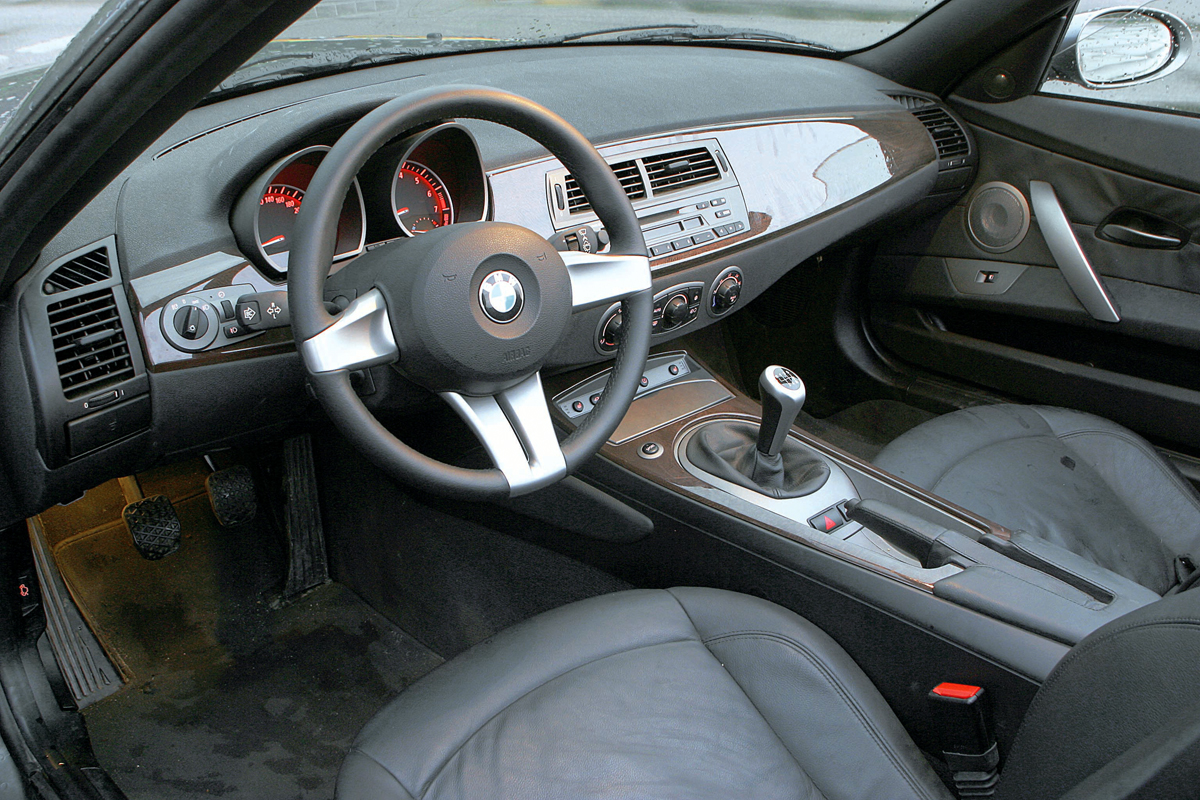 Причем Z4 — автомобиль на редкость однородный по плотности дизайнерских решений: и внешность, и интерьер одинаково интересны. Снаружи взгляд приковывают рельефные обводы боковин и косая черта на переднем крыле с эмблемой-«поворотником» посередине. Внутри — широкая «фаска» на передней панели, дверные ручки в стиле «техно» и руль с необычными металлизированными спицами. Правда, «фаска» на панели была отделана не матированным алюминием, как в «спортивных» версиях интерьера Z4, а полированным шпоном. Смотрится богато. Родстер бизнес-класса?