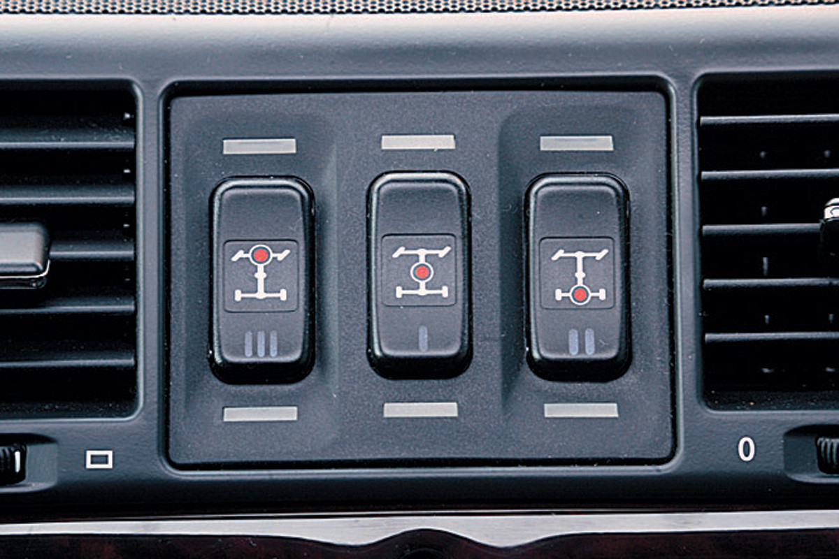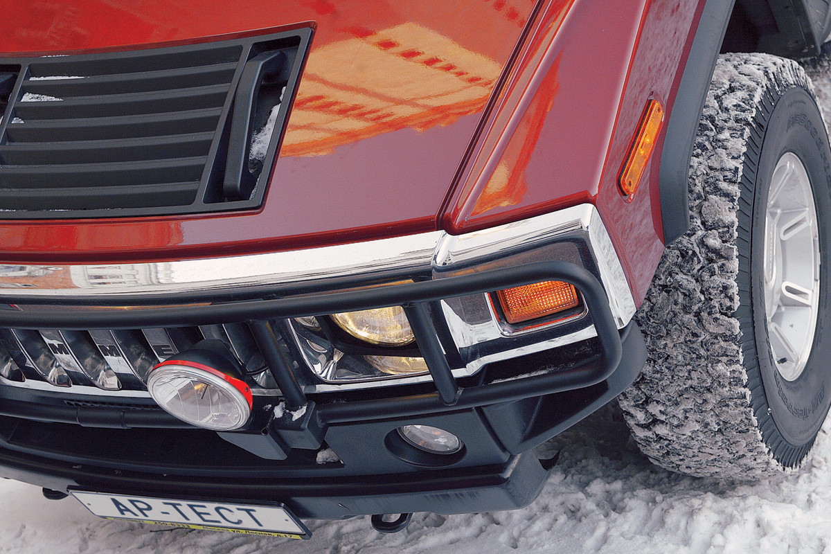 Прежде чем пускать по следам G-вагена Hummer, мы долго раздумывали. Ведь с конструктивной точки зрения Н2 выглядит бледненько: ничего общего с первым «настоящим» Хаммером, сделанным из многоцелевого армейского вездехода Humvee, у него нет. Заглядываешь под днище и удивляешься: торчащие рычаги подвески, жесткая задняя балка, смешно «растопыренные» подножки. Есть, правда, кнопочка управления пневмоэлементами задней подвески, но она служит всего-навсего для компенсации загрузки.