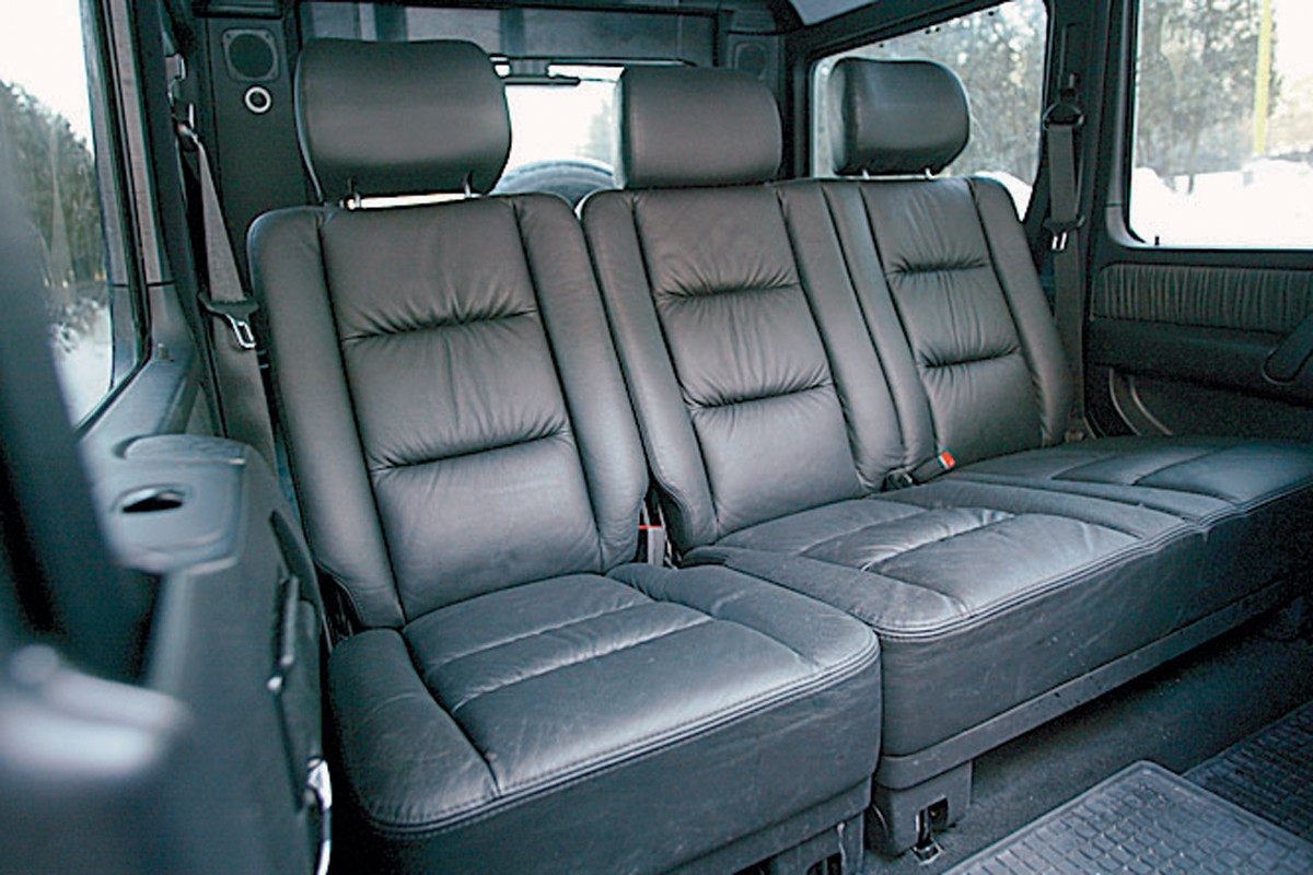 Если бы не жесткая подвеска, то G-ваген мог бы считаться очень комфортабельным автомобилем для задних пассажиров: сидеть на трехместном кожаном диване очень удобно. Классно подобран угол наклона спинки и профиль сидений, к тому же под рукой — широкий «мечтательный» подоконник. Вот только тепло к ногам доходит плохо — напольных дефлекторов системы вентиляции сзади мы не обнаружили.