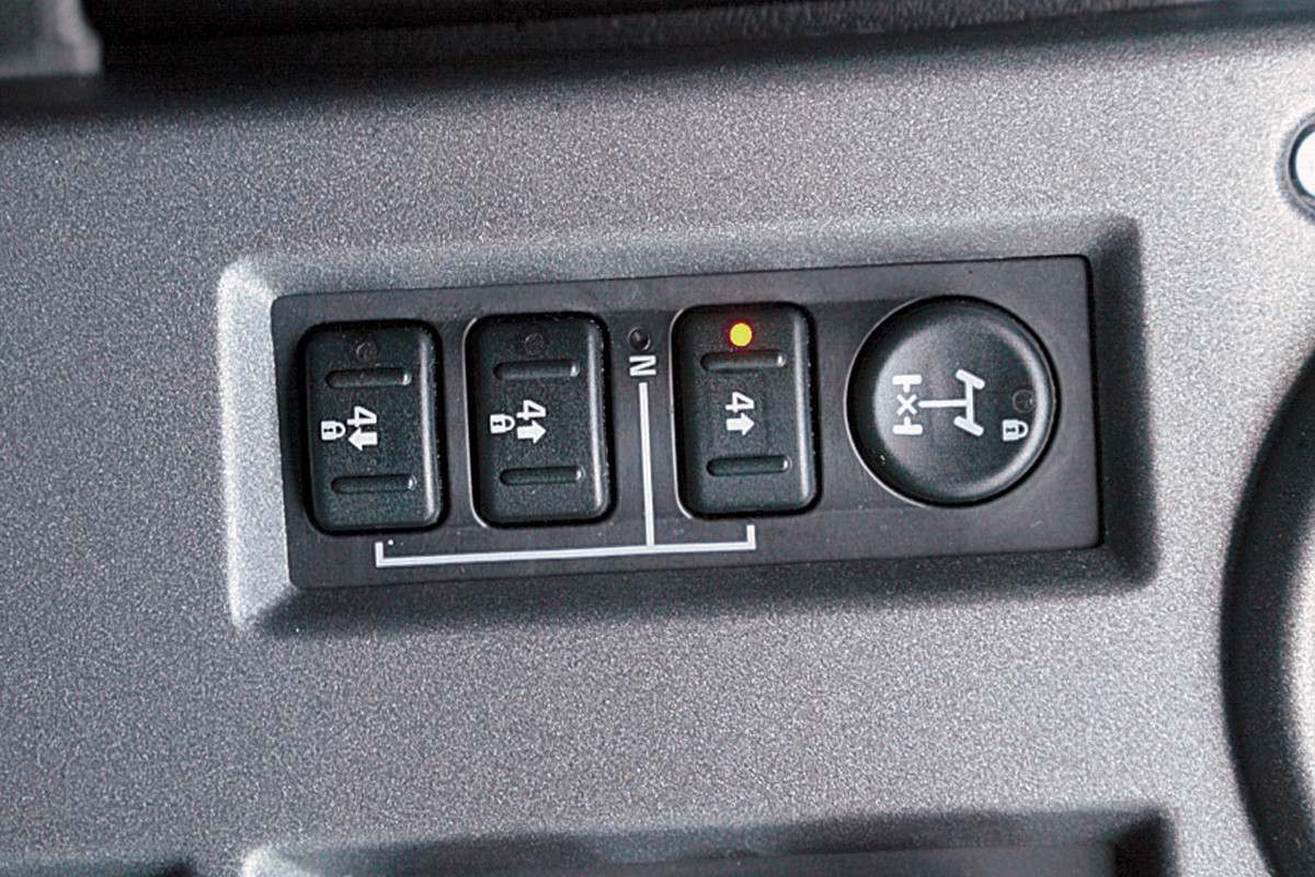 Блок управления хаммеровской трансмиссией. Три прямоугольные клавиши — нормальный режим (4 hi), он же плюс блокировка межосевого дифференциала, включение нижнего ряда в раздатке (4 low) с блокировкой «центра». Круглая кнопка — блокировка заднего межколесного дифференциала