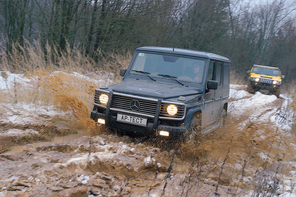При общем внедорожном паритете Mercedes G500 и Hummer H2 — автомобили все же разные. Старый добрый G-ваген вне дорог может очень многое, но — в руках опытного водителя. А успешный «офф-роуд» на Хаммере дается гораздо проще. Напролом! И с заметно большим комфортом.