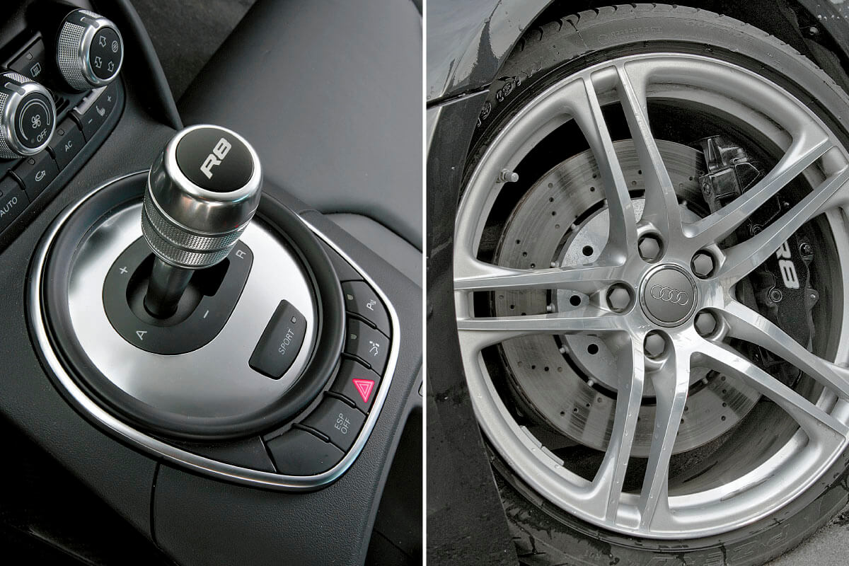 Управление роботизированной коробкой вызвало лишь одно замечание: логичнее переходить на ступень ниже движением рычага вперед, а не назад, как сделано на Audi / На нашем Audi стояли обычные тормоза, а вскоре можно будет заказать и металлокерамические диски (они доступны и для Ferrari)
