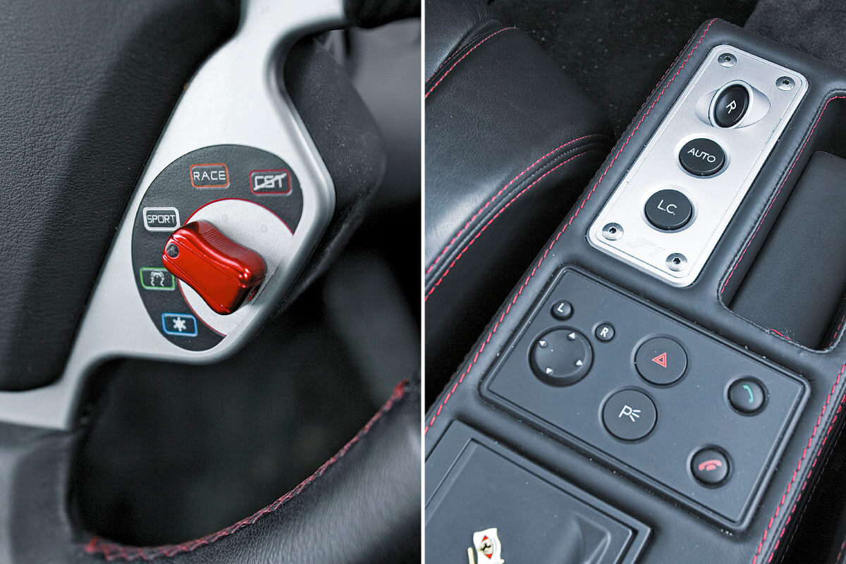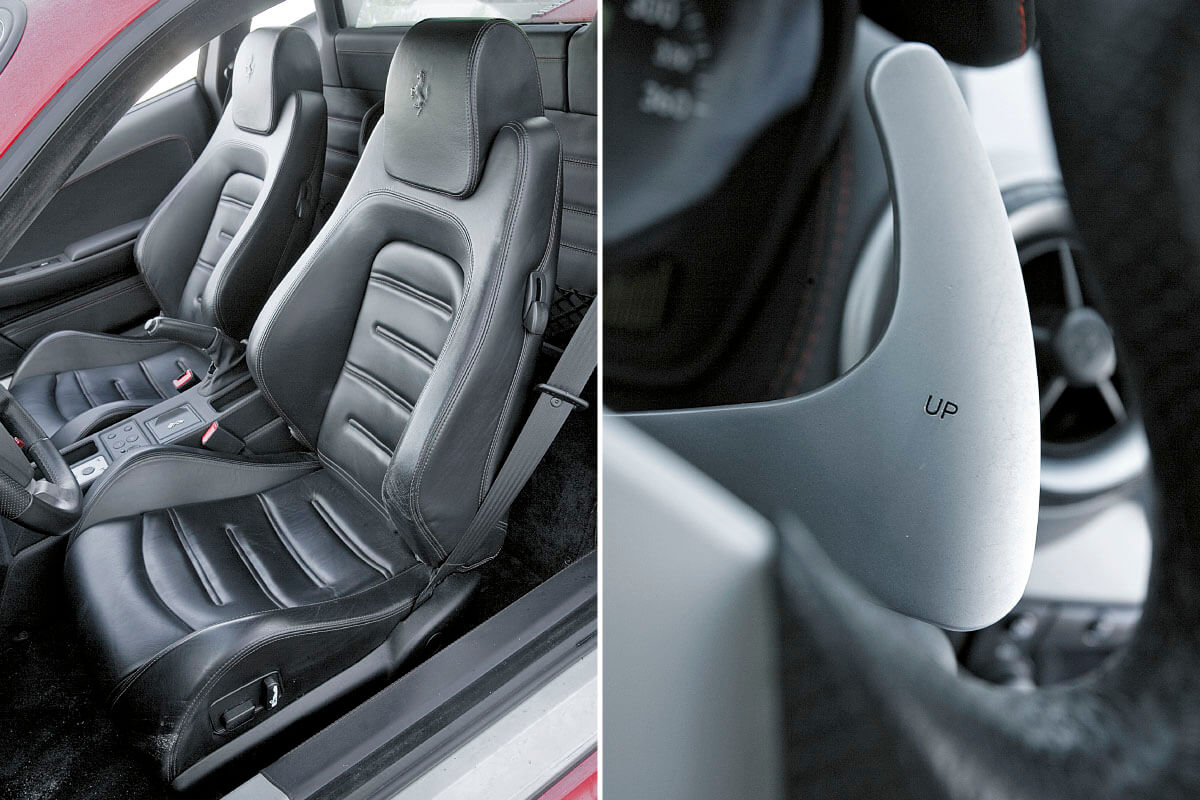 Сиденья Ferrari рельефны, но скользкая кожа не способствует фиксации тела / Металлические лепестки управления коробкой Ferrari выглядят серьезно, а отклики «робота» — самые быстрые