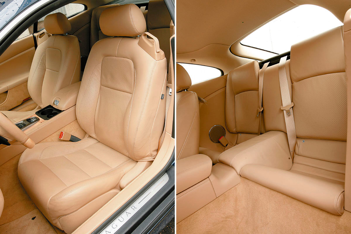 Упрекать сиденья Ягуара в недостаточной боковой поддержке грешно. Они именно такие, какие и нужны этой машине: не сиденья, а кресла / Пролезть сюда еще можно, но сидеть — лишь при условии, что спереди — лилипут. Но тогда лучше поменяться местами