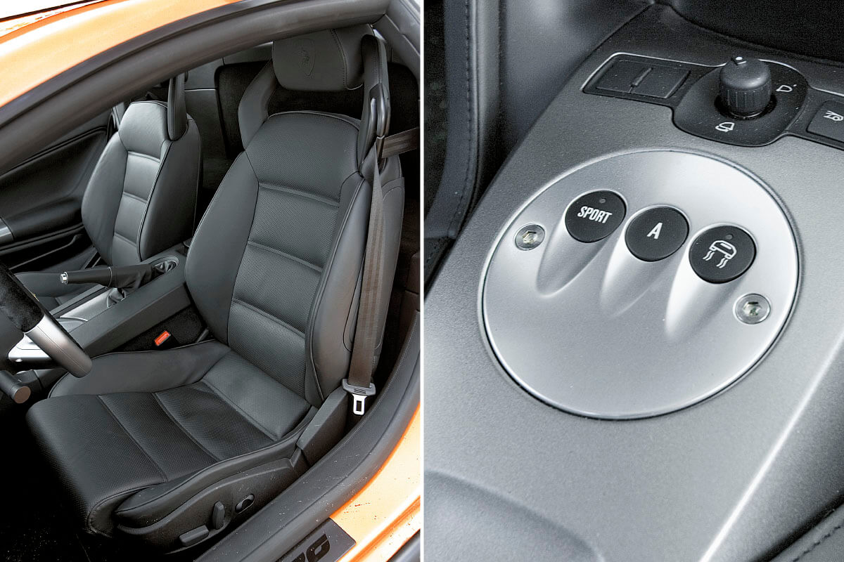 Запуск мотора — кнопкой, выбор режимов трансмиссии — тоже кнопками. Напомним, что «в базе» на Gallardo (равно как и на Audi R8, и на Ferrari F430) — обычная шестиступенчатая коробка, а за доплату (наш случай) она роботизирована. Педали сцепления нет, рычага переключения передач — тоже, зато есть подрулевые лепестки (левый — для перехода на ступень вниз, правый — вверх, а чтобы включить «нейтраль», надо притянуть оба лепестка).