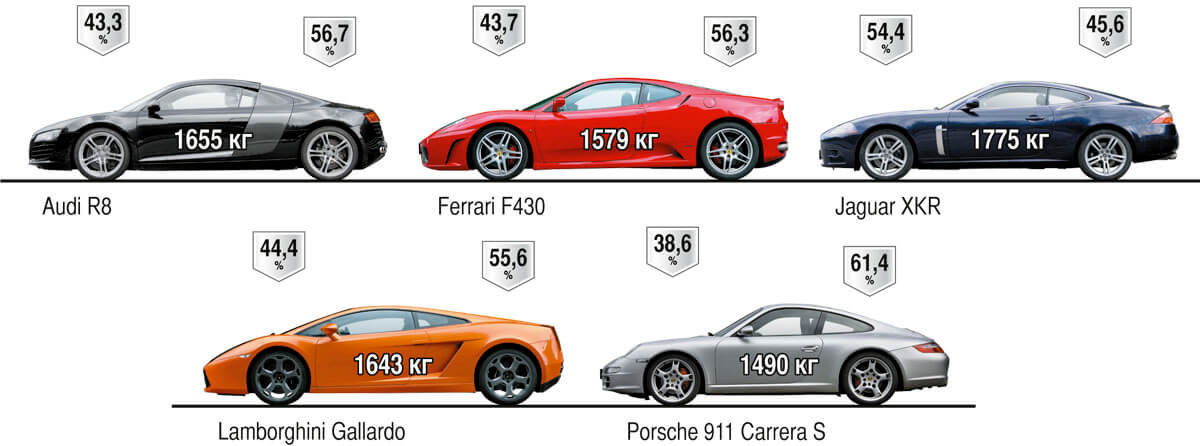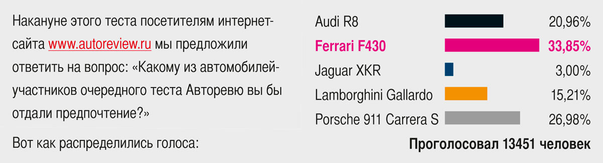 На втором месте — Porsche 911 Carrera S, третье и четвертое места делят Audi R8 и Ferrari F430, а Jaguar XKR, пусть формально и оказался на пятом месте, но это лишь в «спортивном» контексте данного теста. Jaguar другой, и настроение создает другое. Отнесемся с пониманием.