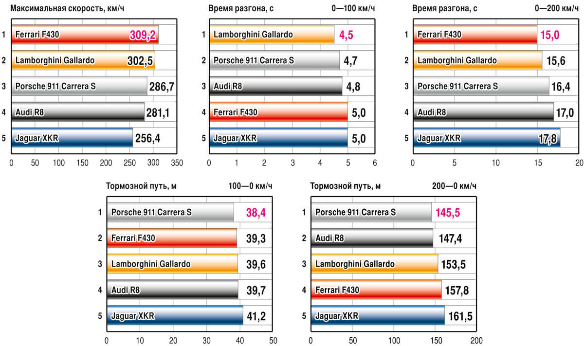 То, что Lamborghini достигнет сотни быстрее всех, сомнений не вызывало. Так и есть: 4,47 с. Хотя заметим, что это почти на полсекунды дольше, чем обещано. Второе место занимает… нет, не Ferrari, не Audi, а Porsche — c его приводом только на задние колеса и «по паспорту» самым слабым мотором: 4,65 с. Между прочим, это на 15 «соток» быст-рее, чем обещано. На третьем месте Audi R8: 4,83 с. Неплохо, но все же дольше паспортных 4,6 с. А четвертое место Jaguar разделил с Ferrari: оба набрали сотню за пять секунд. Но если Jaguar перекрыл заводской норматив (5,2 с), то Ferrari разгонялся на секунду дольше.