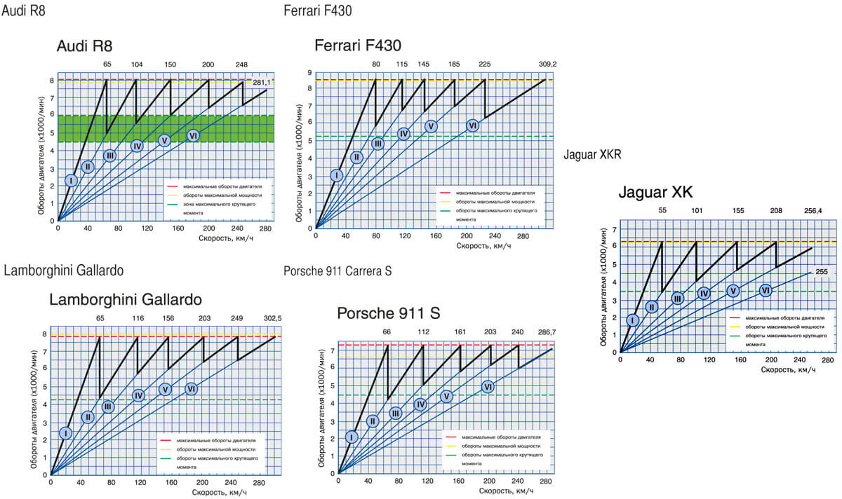 Теперь, зная истинный вес, можно предвосхитить и расклад в спринте до 100 км/ч. Разделив мощность на массу (не ту, что в «паспорте», а ту, что в протоколе Мохова!), получаем значение так называемой энерговооруженности. И делаем ставку на Lambo: 316,5 л.с. на тонну. Далее по убывающей: Ferrari F430 (310,3), Audi R8 (253,8), Porsche 911 S (238,3) и Jaguar XKR (236,6). Совпадут ли прогнозы с результатами замеров?