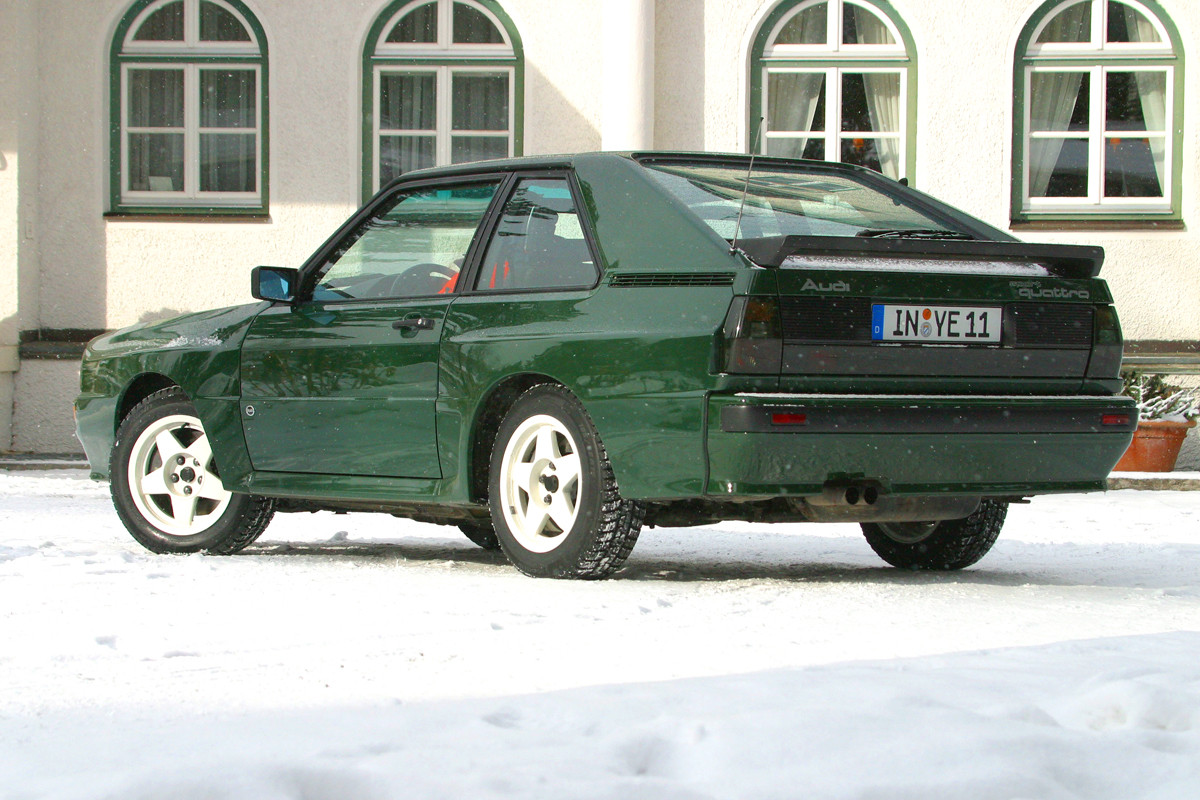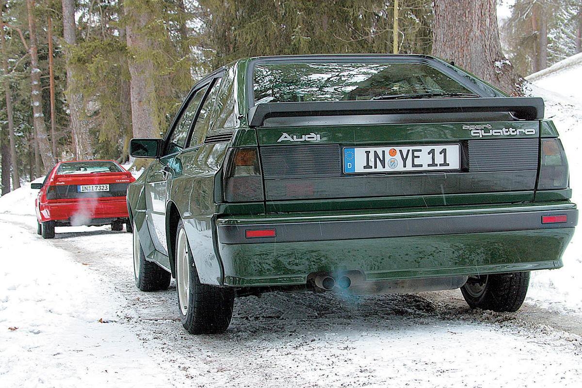Единственные в своем роде стояли в гараже гостиницы рядышком. Гармоничное красное купе — это то, что немцы называют Ur-quattro, то есть самое что ни на есть первое quattro. А зелененький крокодильчик — это Sport quattro или Kurze (коротышка), короткобазная (–32 см) модификация, созданная в 1983 году специально для омологации раллийной машины группы В — той самой, что принесла Audi два кубка конструкторов в чемпионате мира.