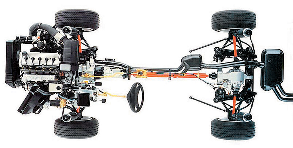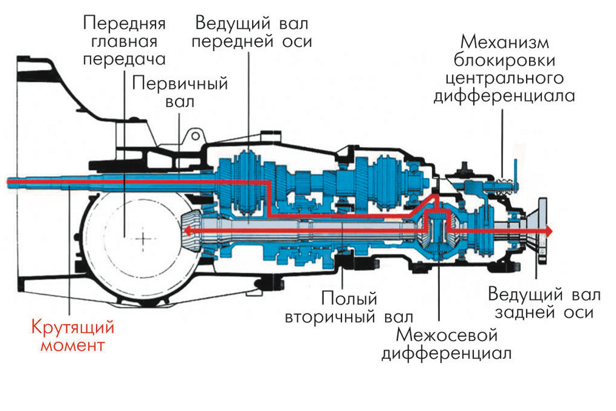 Чтобы избавиться от тяжелой раздаточной коробки в трансмиссии, инженеры Audi применили элегантное техническое решение — ведущий вал передней оси они пропустили через полый вторичный вал коробки передач