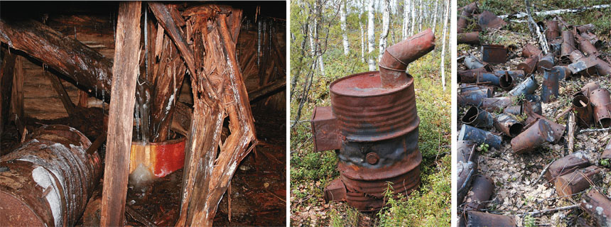 Утренний выход в лес вызвал новую бурю эмоций. По сравнению с «перепаханными» местами боев в средней полосе России Карелия — это terra incognita! Отойдя от лагеря на километр, мы обнаружили четыре нетронутых блиндажа, гору немецких противогазов, обломки боевой техники и разрушенный тыловой склад, вокруг которого валялось несколько десятков походных печек и угольных кофейников. Железо ржавое, но сохранность с учетом прошедших шестидесяти лет очень приличная.