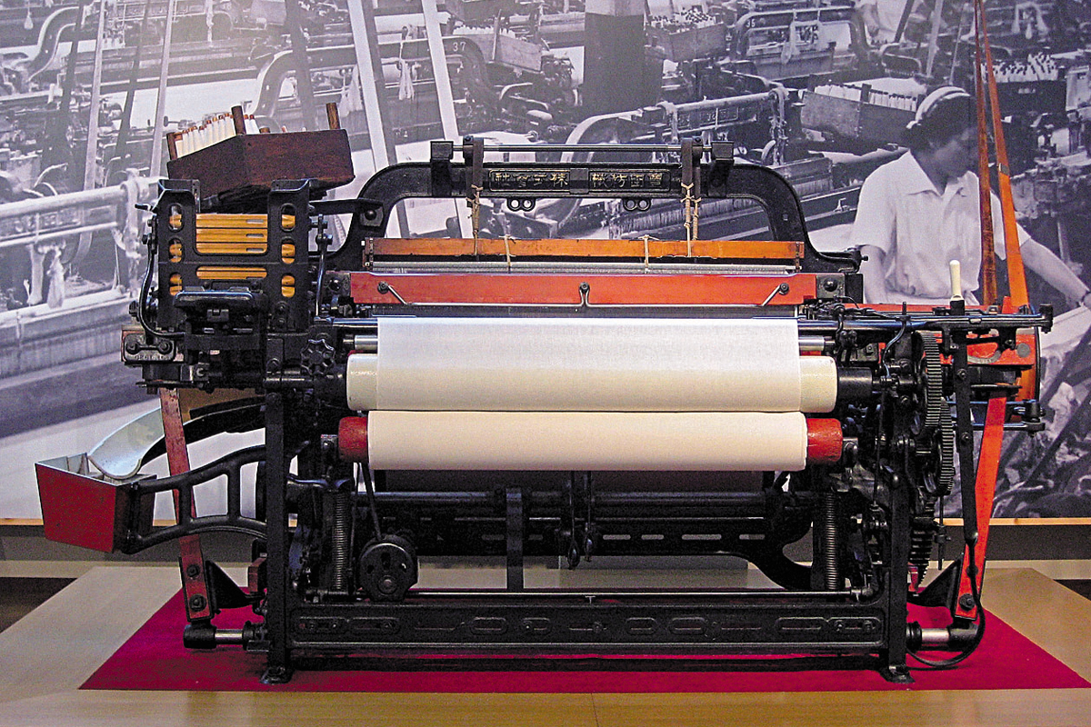 Над устройством станка Toyoda Type G Сакичи Тойода начал работать с 1904 года, когда в Японию впервые попали американские ткацкие автоматы Northrop и Draper. На снимке серийная модель образца 1927 года: слева сверху установлен магазин для автоматической смены челноков (у американских станков Northrop механизм автозамены был бобинным)