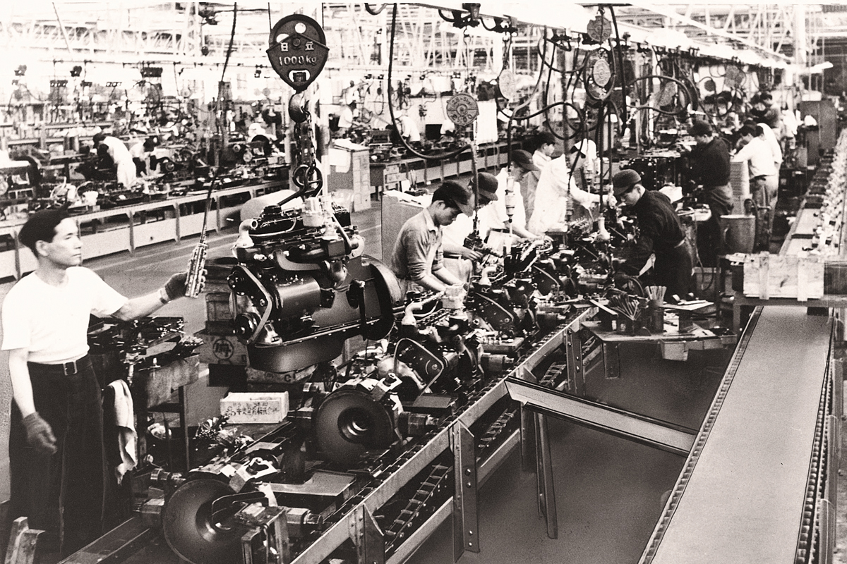 Вплоть до 60-х годов основным бизнесом Тойоты были легкие грузовики: легковые автомобили Toyopet спросом не пользовались. Обратите внимание на то, что сигнальной системы на сборочной линии еще нет — на конвейере завода в Мотомаси андон впервые появится в 1961 году