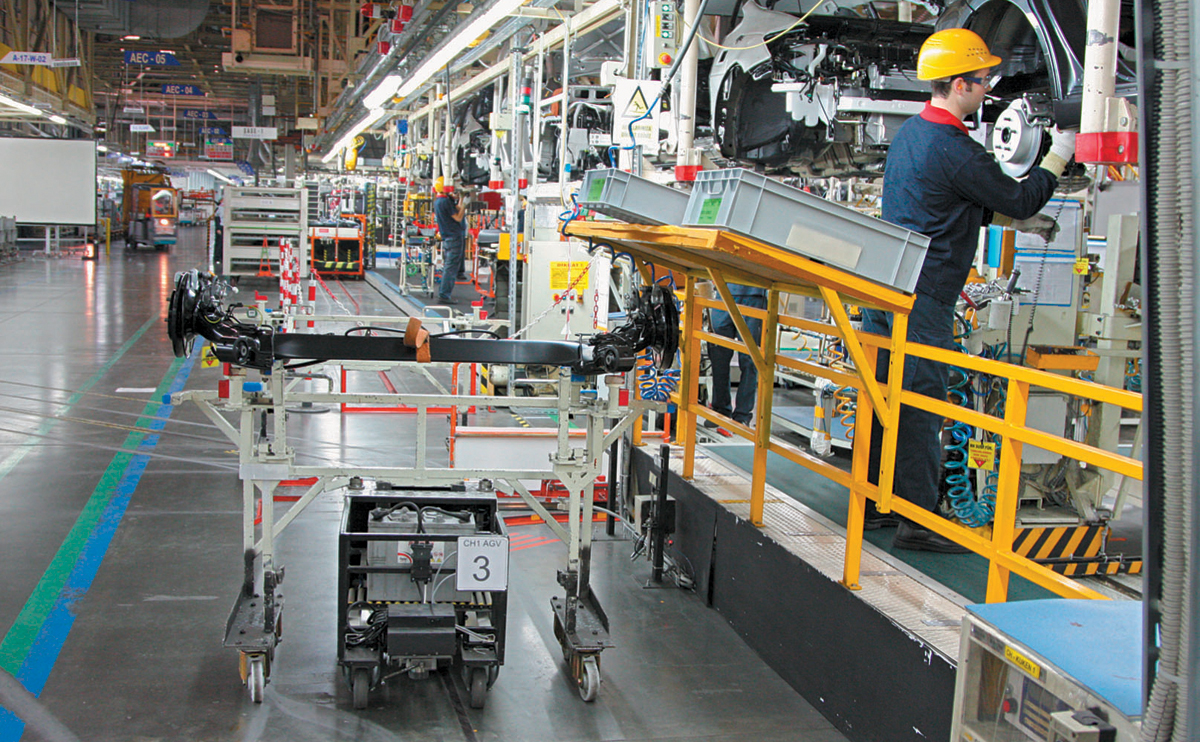 Тележка-робот автоматически подвозит подсобранную заднюю подвеску к конвейеру — это тоже джидока. Тележки придумали и построили работники турецкого завода — это уже кайзен