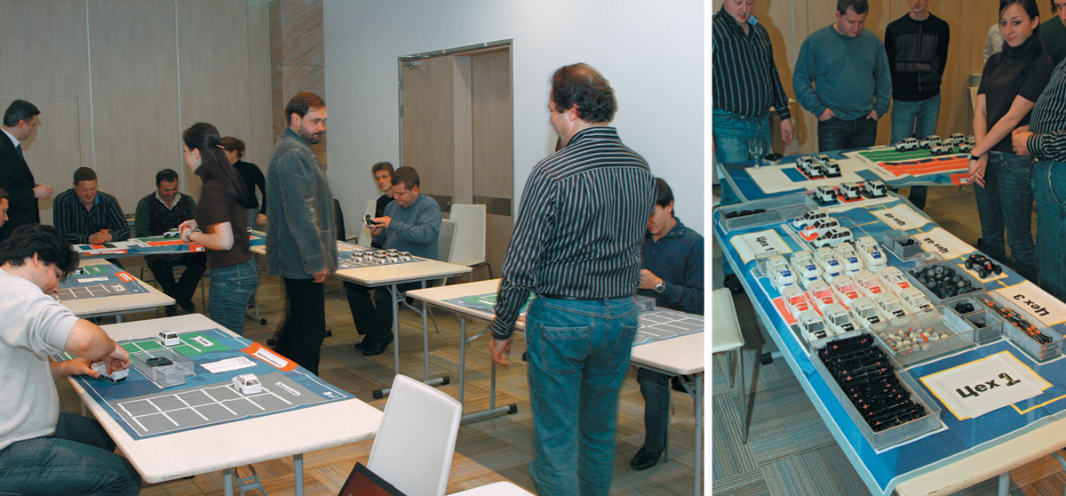 Для обучения основам TPS тойотовцы широко используют ролевые игры. Слева — пример нерационального производства, где игрокам предлагается собирать специально сделанные модельки внедорожников Toyota Land Cruiser Prado в цехах (столах), расположенных далеко друг от друга. А справа — пример компактного производства с оптимизированными функциями персонала: все умещается на одном столе