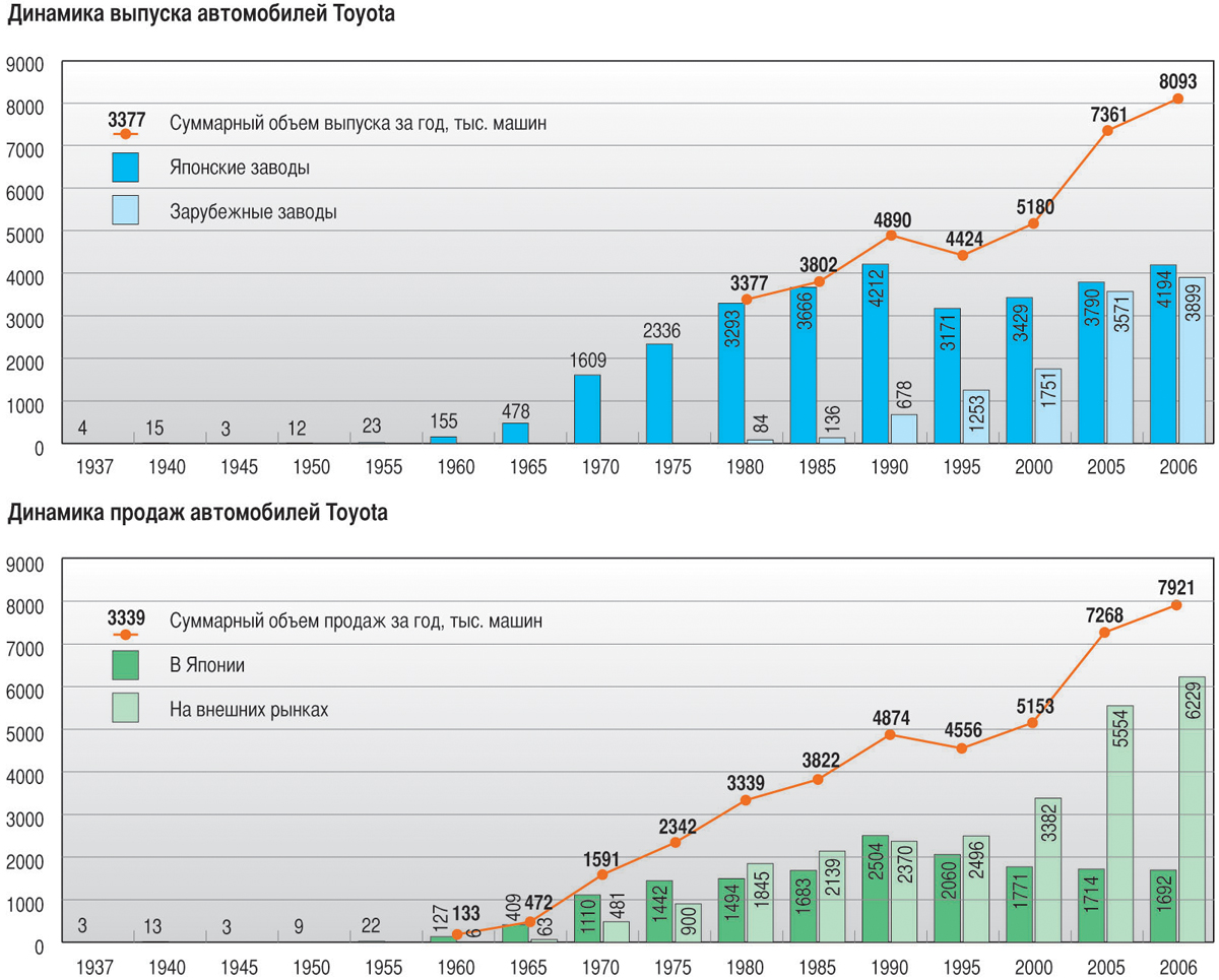 На этих графиках хорошо прослеживается вся история Тойоты. До 60-х годов это маленькая фирма по выпуску легких грузовиков, но уже в 1965 году начинает работать TPS, и объем производства легковушек достигает полумиллиона, а спустя пять лет превышает полтора миллиона машин. С начала 80-х рост обеспечивает постоянно растущий экспорт (прежде всего в США), а с 90-х — и зарубежное производство