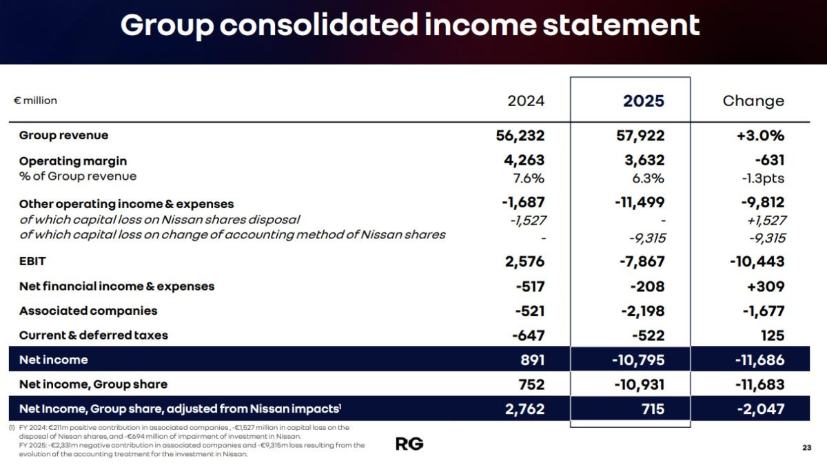 Французский автогигант Renault Group поделился финансовой отчетностью за 2025 год. Компания отрапортовала о позитивной динамике практически всех статей бизнеса, но все равно зафиксировала чистый убыток в размере 10,8 млрд евро при выручке 57,9 млрд евро. Для сравнения: 2024 год она закончила с прибылью 891 млн евро при выручке 56,2 млрд евро.